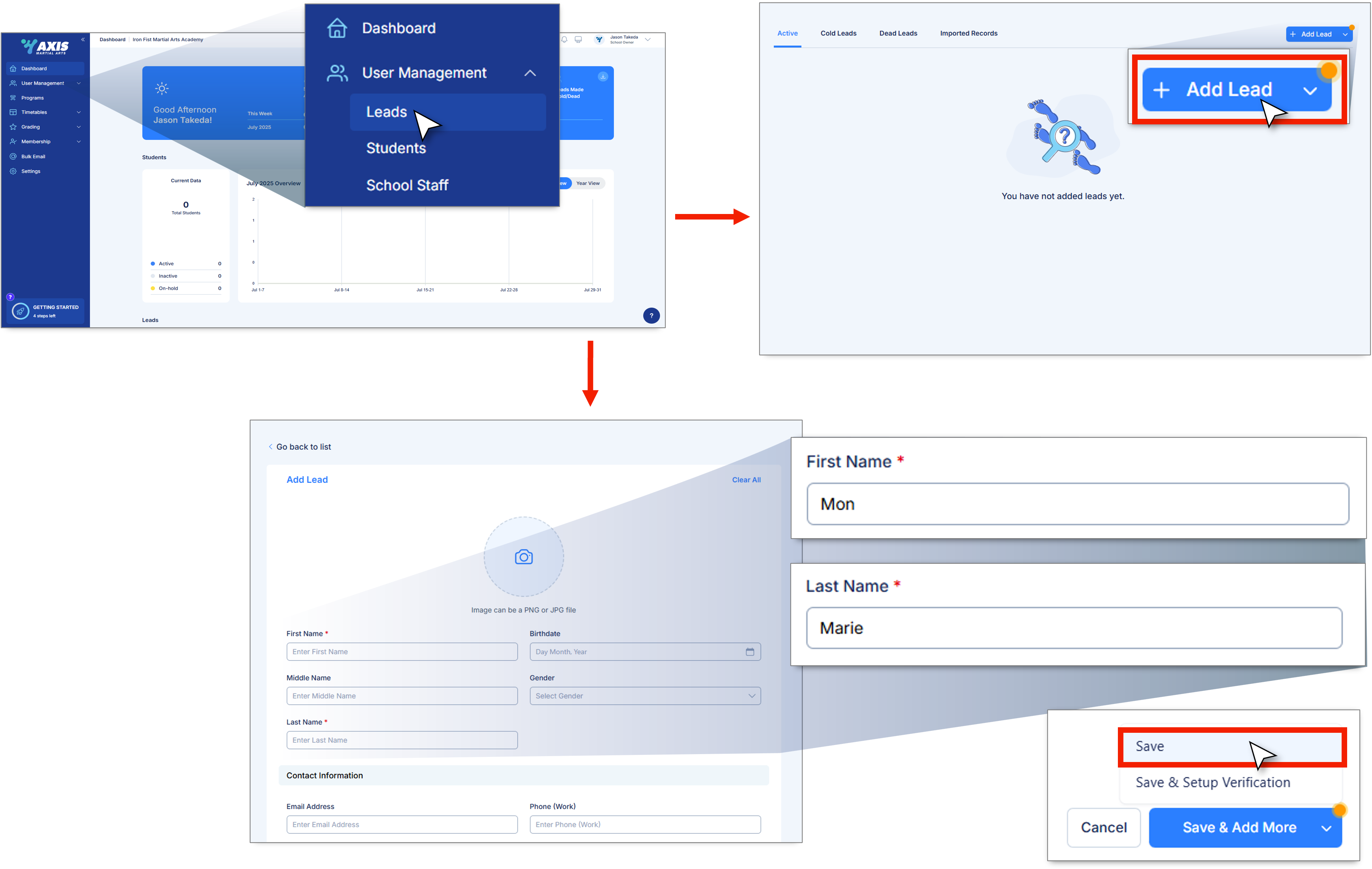 Note: As soon as a lead is added with an email address, they will be sent an account verification email. This is so they can sign the legal documents, and be ready to try a class.