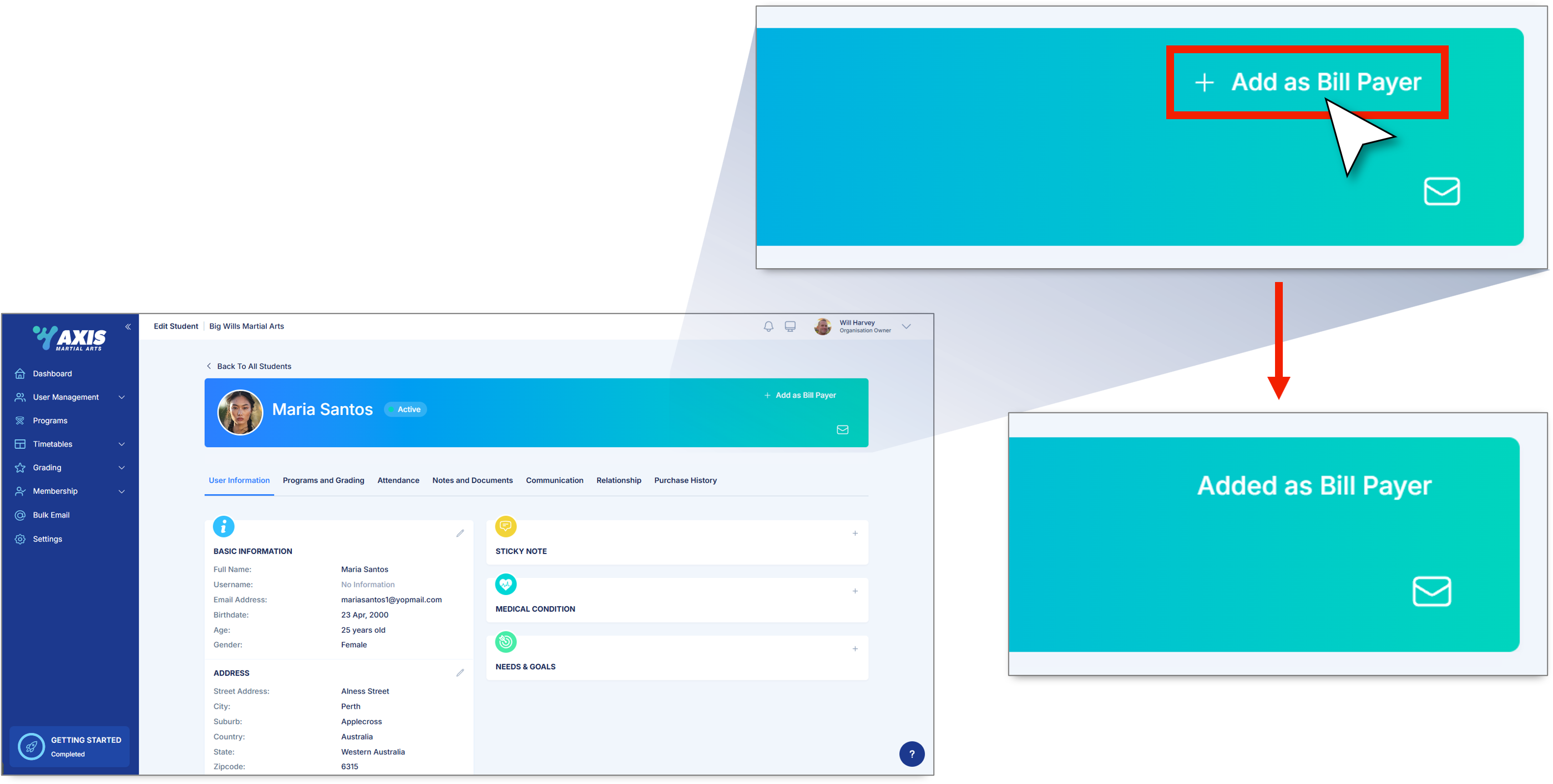 If you are using Stripe or Debit Success for memberships you will need to make adult students the bill payer.