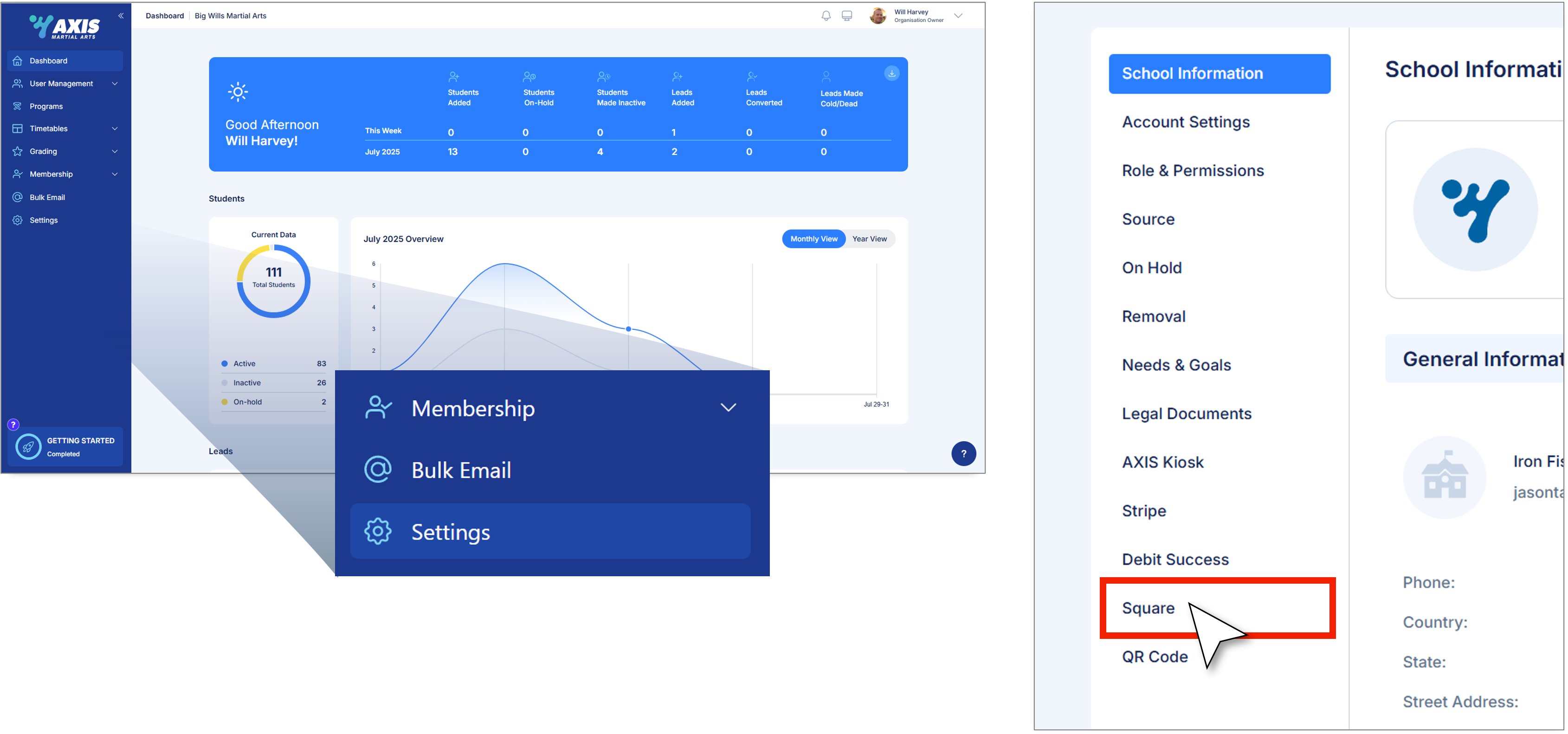 When you connect your Square account to AXIS, any purchases made by a student through Square will appear on their profile in AXIS.