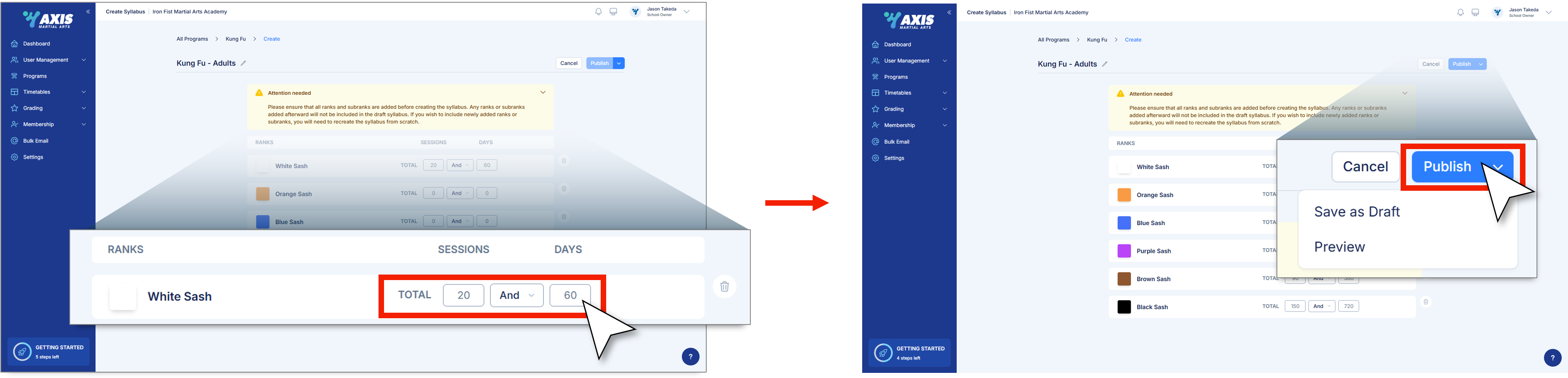 Note: All ranks and sub ranks must be filled with corresponding sessions and/or days before the syllabus can be published or saved as draft.