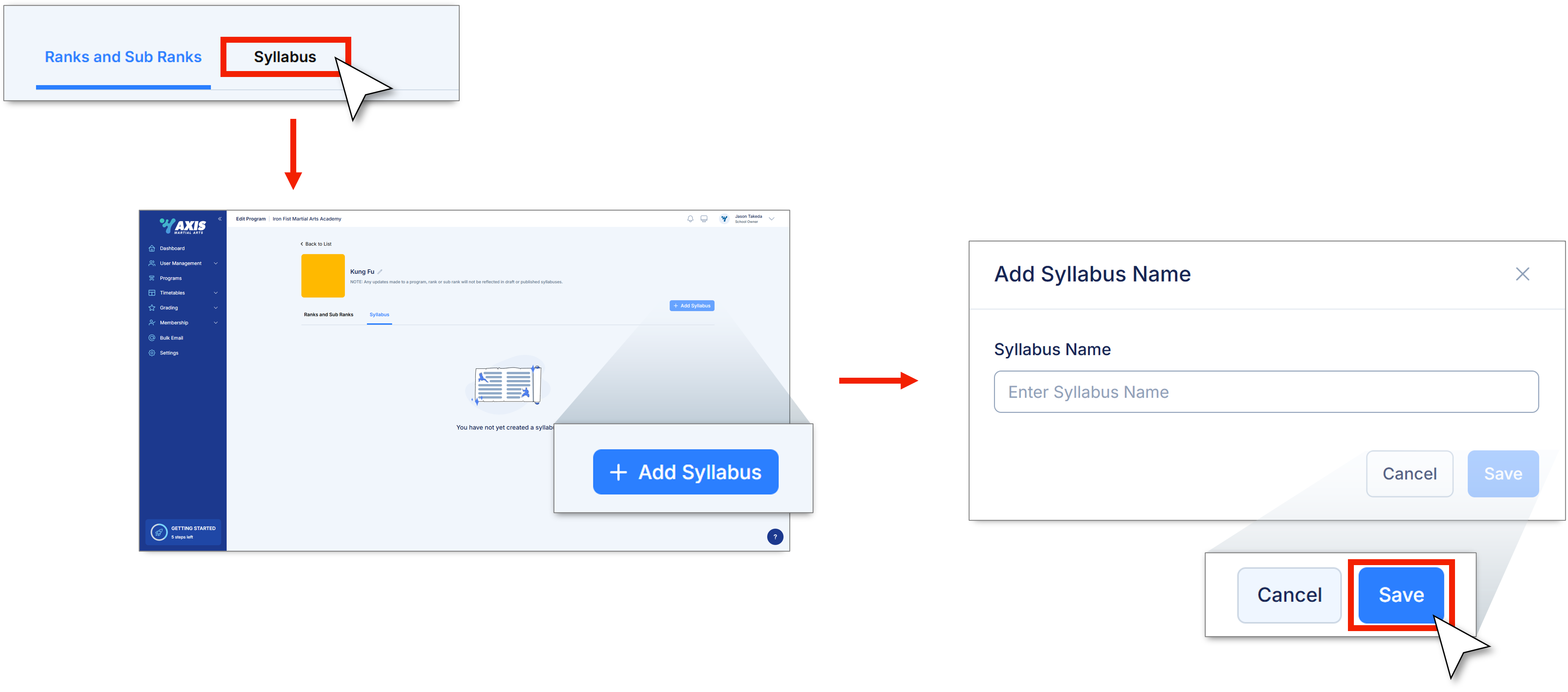 A syllabus is where you configure the requirements for a program. This is done using the number of attendances and / or days for each rank and sub rank. All programs must have at least one syllabus, it is the syllabus that is linked to classes and assigned to students.