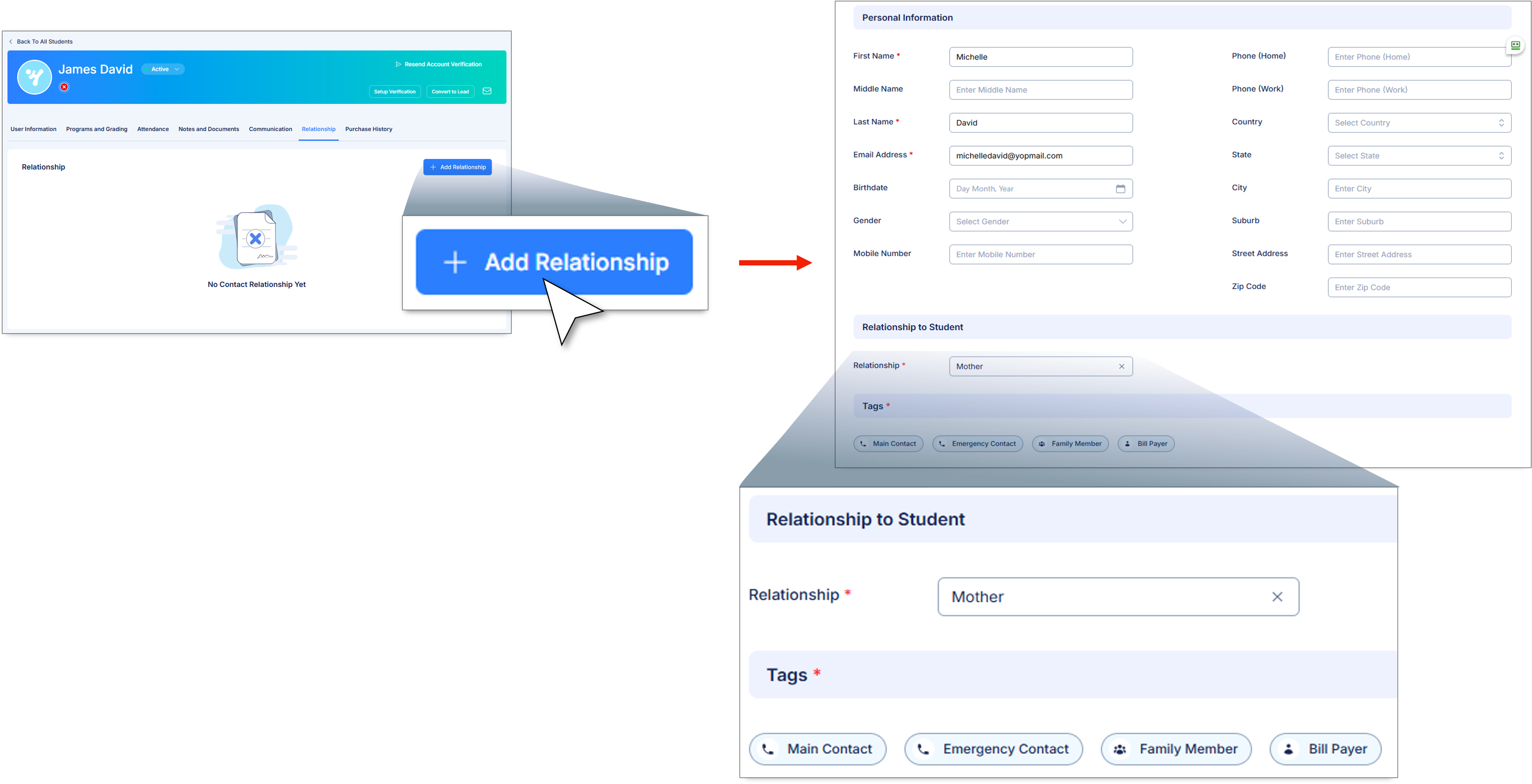 - Input the relationship details (First Name, Last Name and Email Address are mandatory).