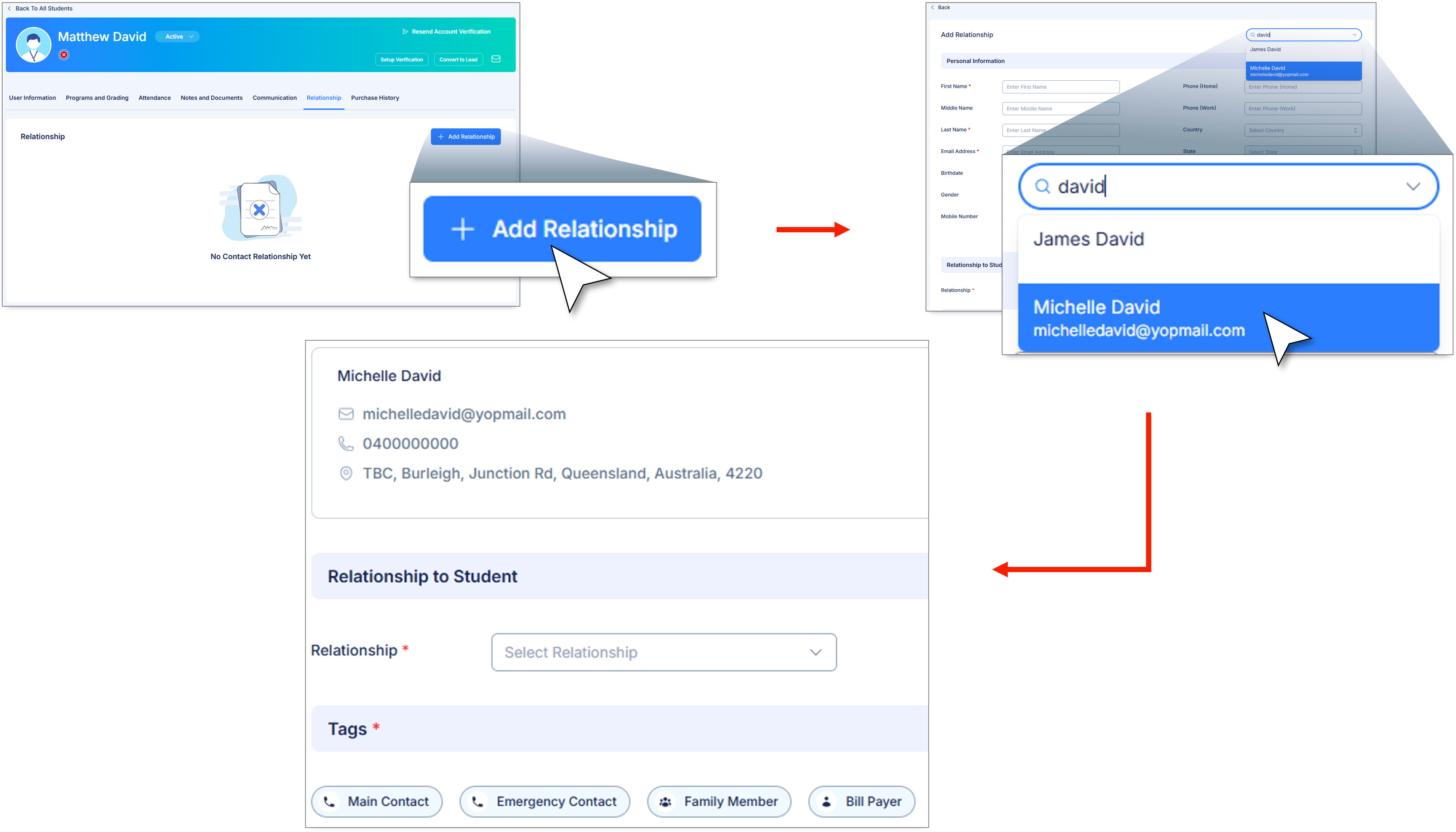 If you are adding students who are siblings and you want them to share an email address, you will have to create a relationship to the parent/guardian for the first lead or student, then when you create the sibling you will have to select the parent/guardian relationship you have already created.