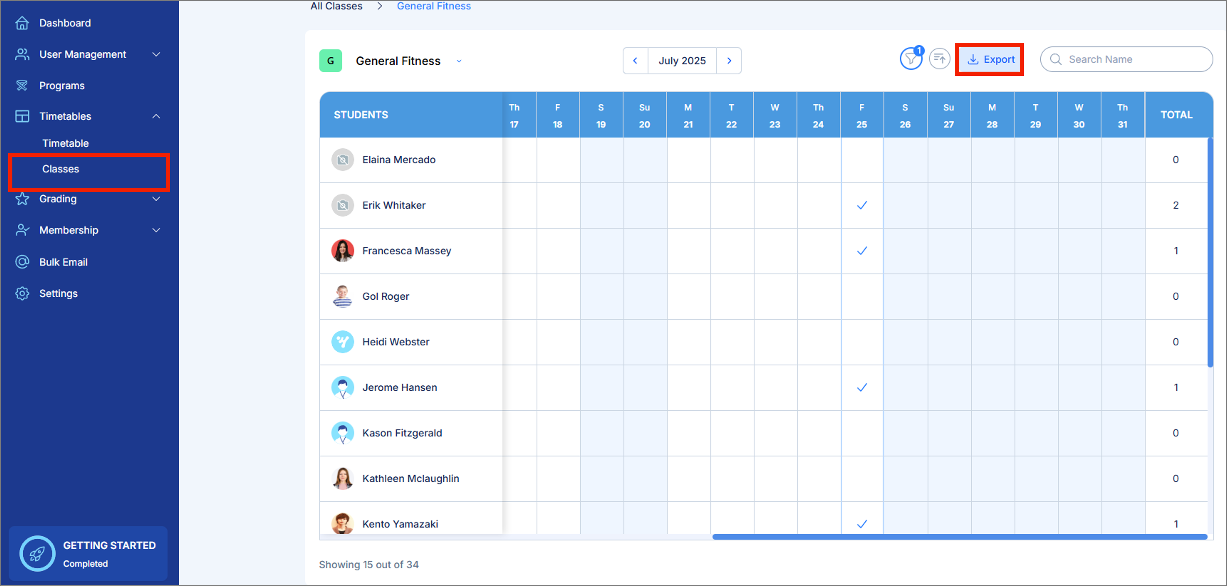 3. Choose the class for which you want to export the attendance.