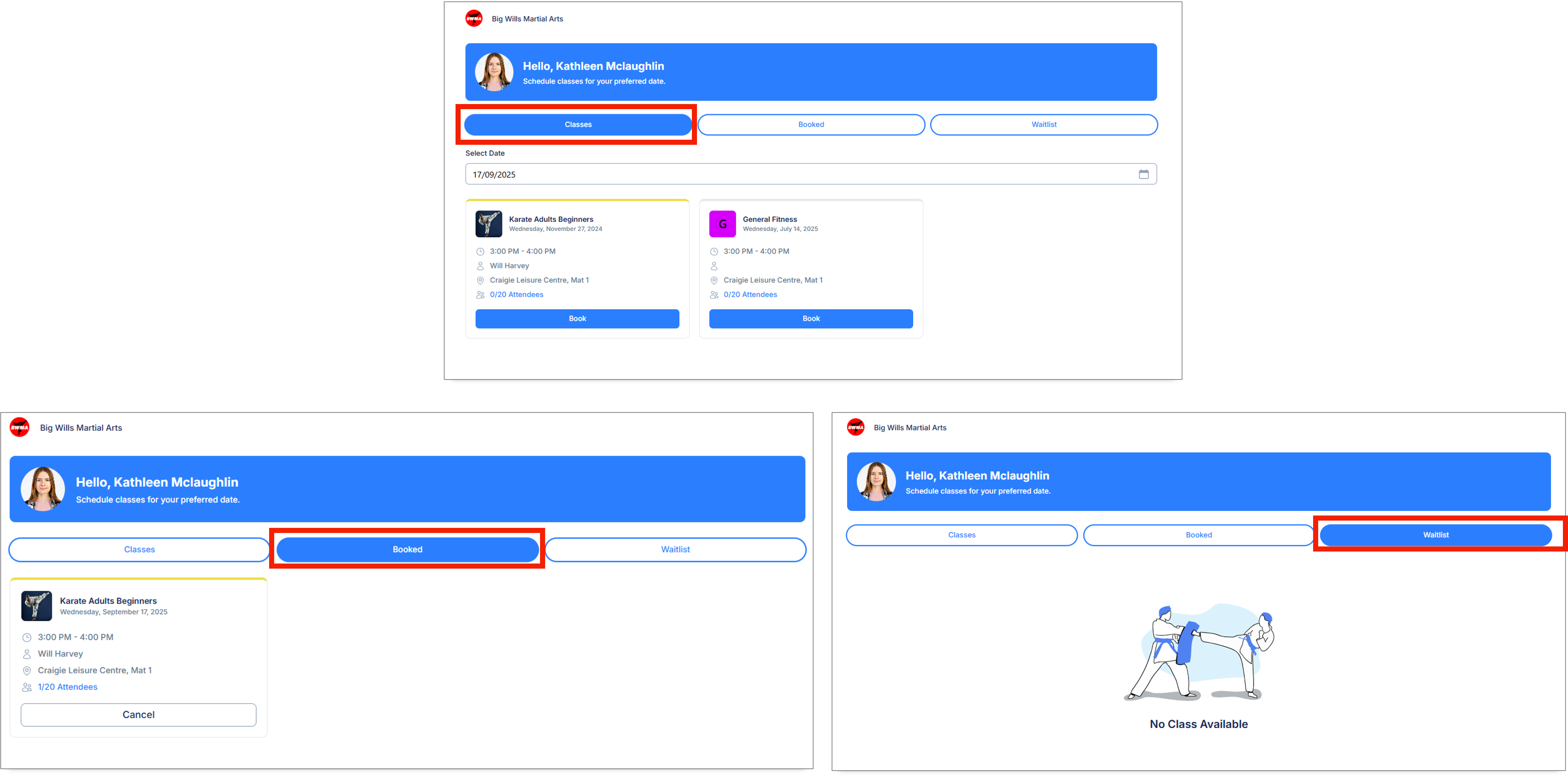 This premium features extend this capability to allow students to reserve their spot in a given class, and go on to a waiting list if the class is already fully booked.