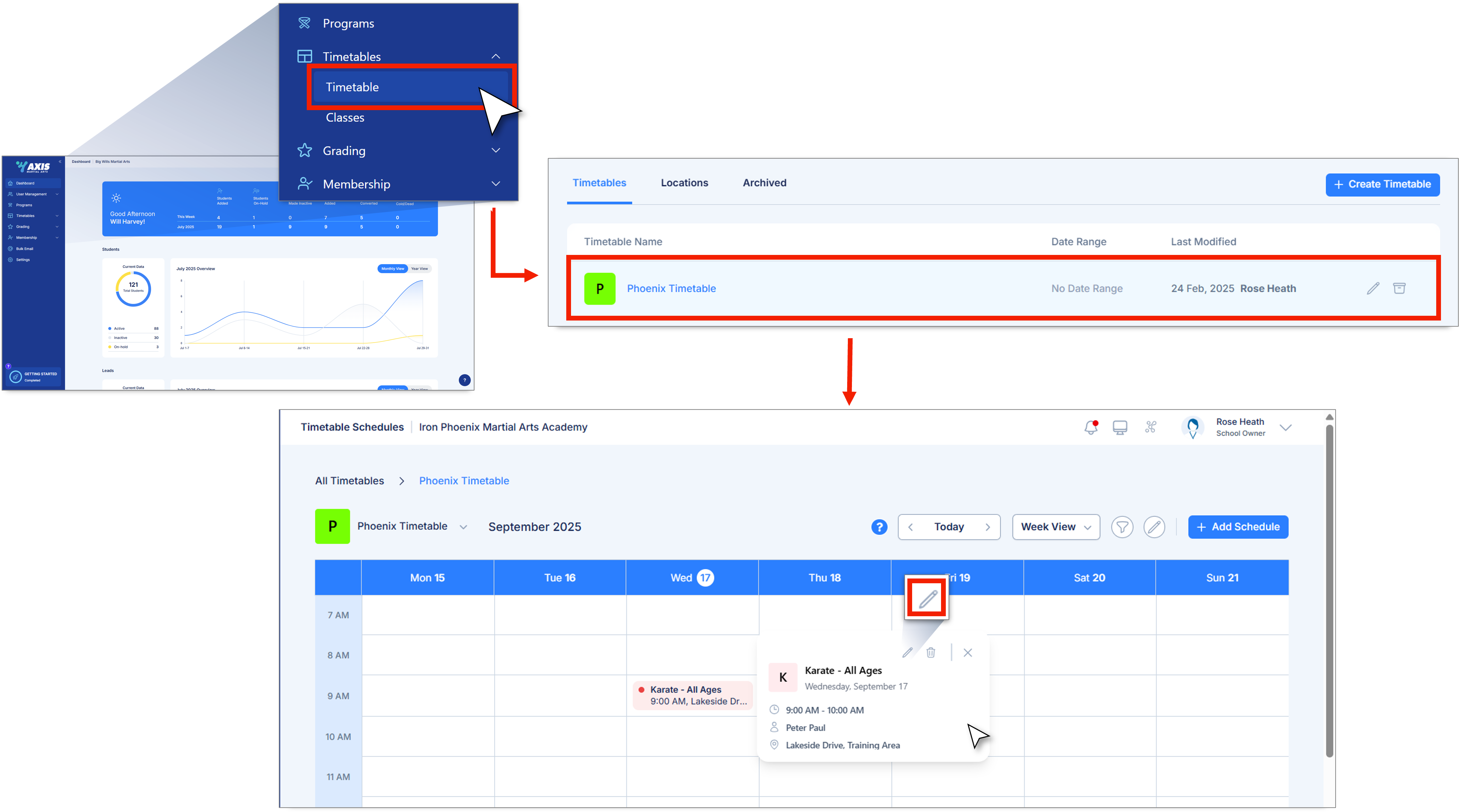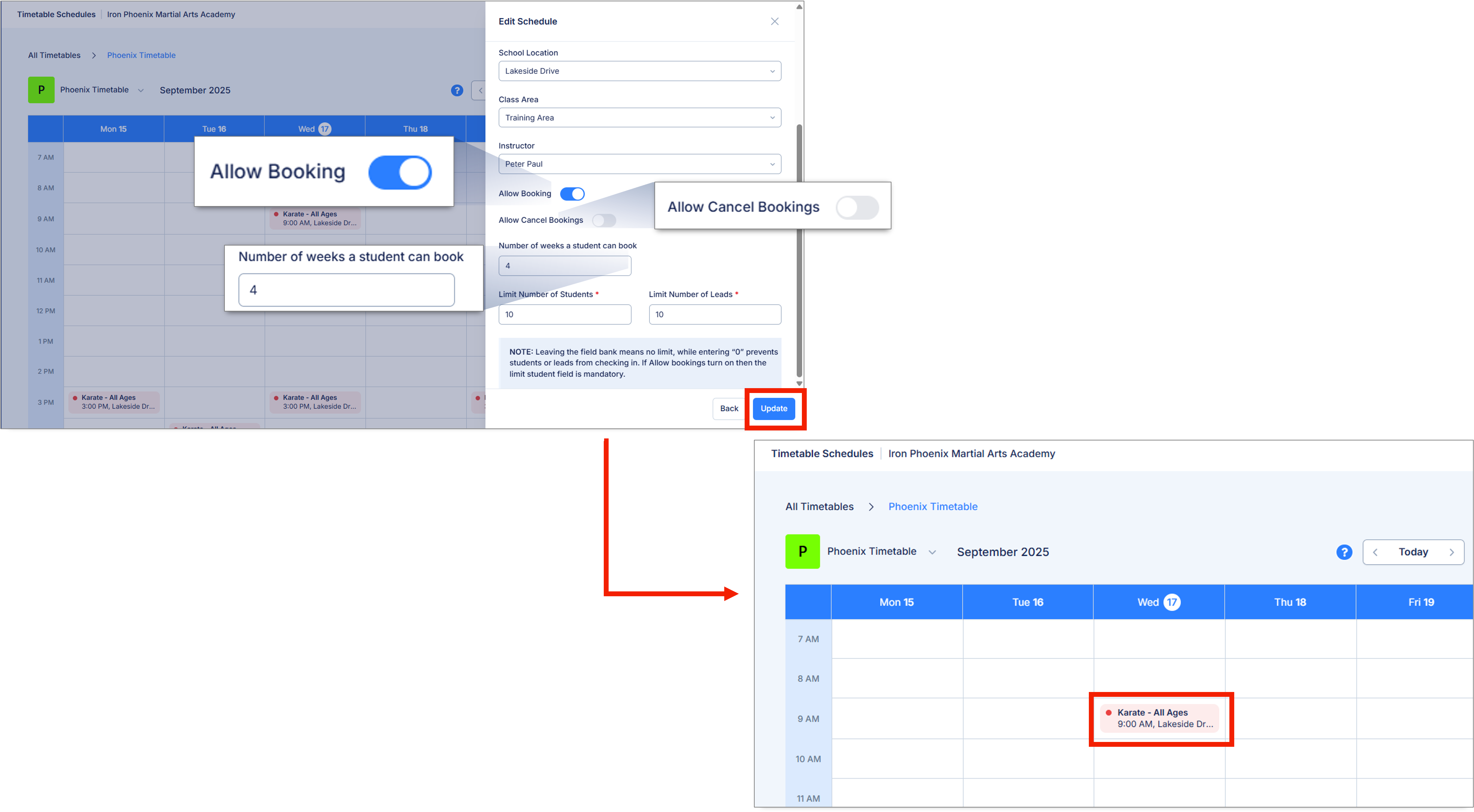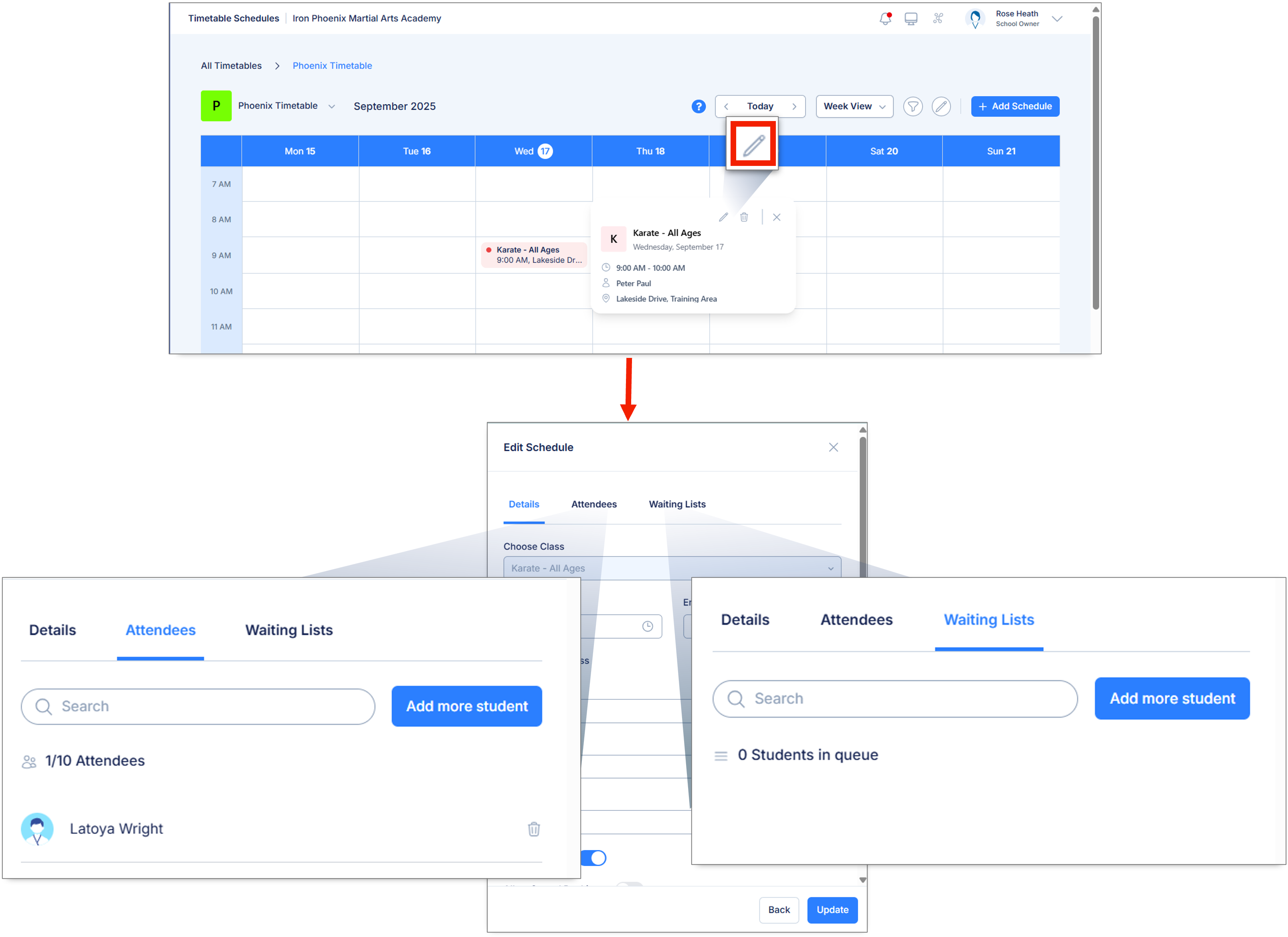 You can view who is booked in and can manually add or remove students to this, and also view the waiting list at the top of the Edit Schedule window.