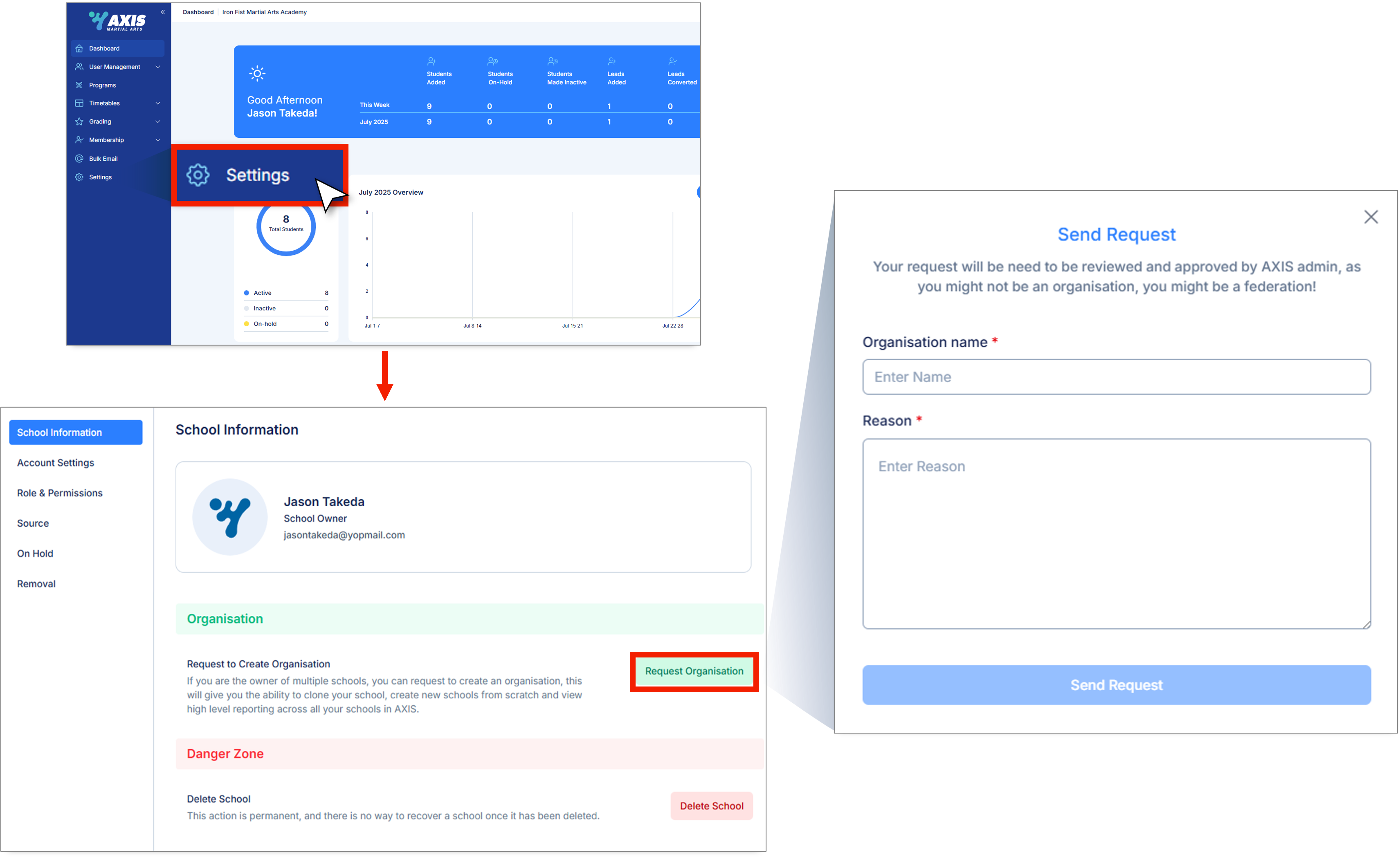 If you are a single school that is part of a large real-world organisation of many schools, linked by the system of martial arts that you teach, you would not have visibility of how those schools are run, and not have access to membership or financial data, so this is not an AXIS organisation.