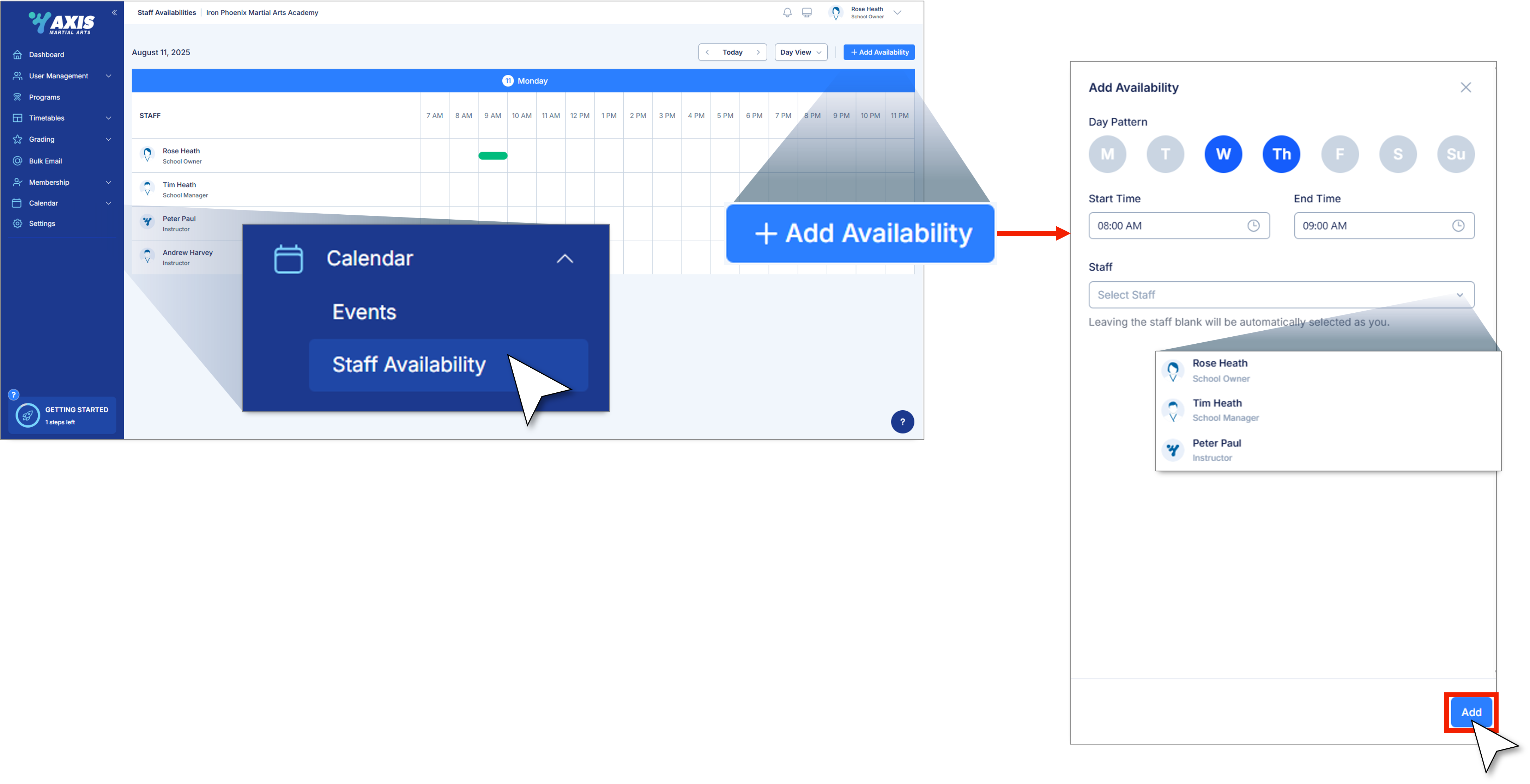 Note: School managers can assign availability for themselves or any other school staff, instructors or referees can only assign availability for themselves.