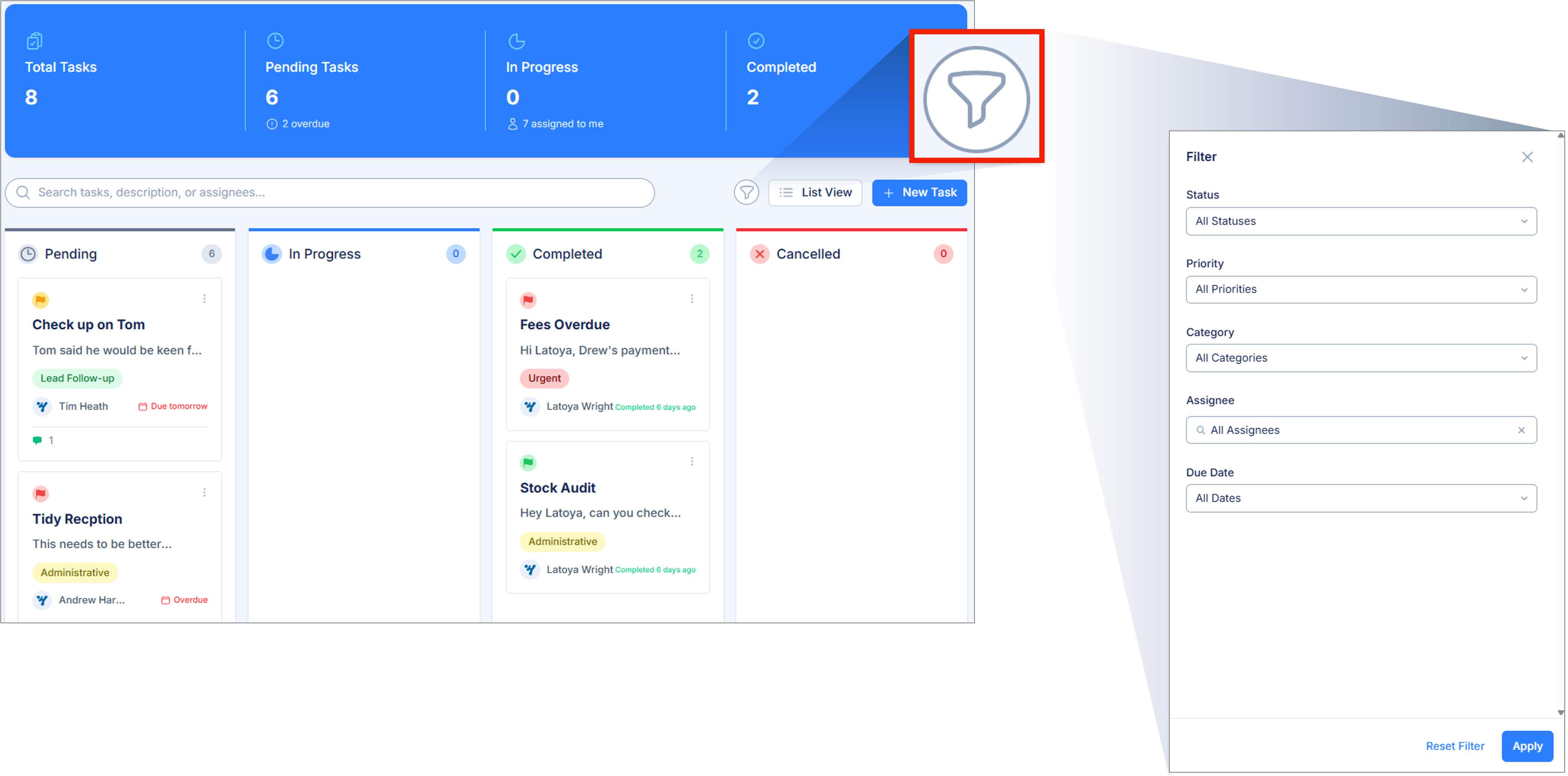 Quickly sort and view tasks by status, priority, assignee, or due date to stay organised and focused.