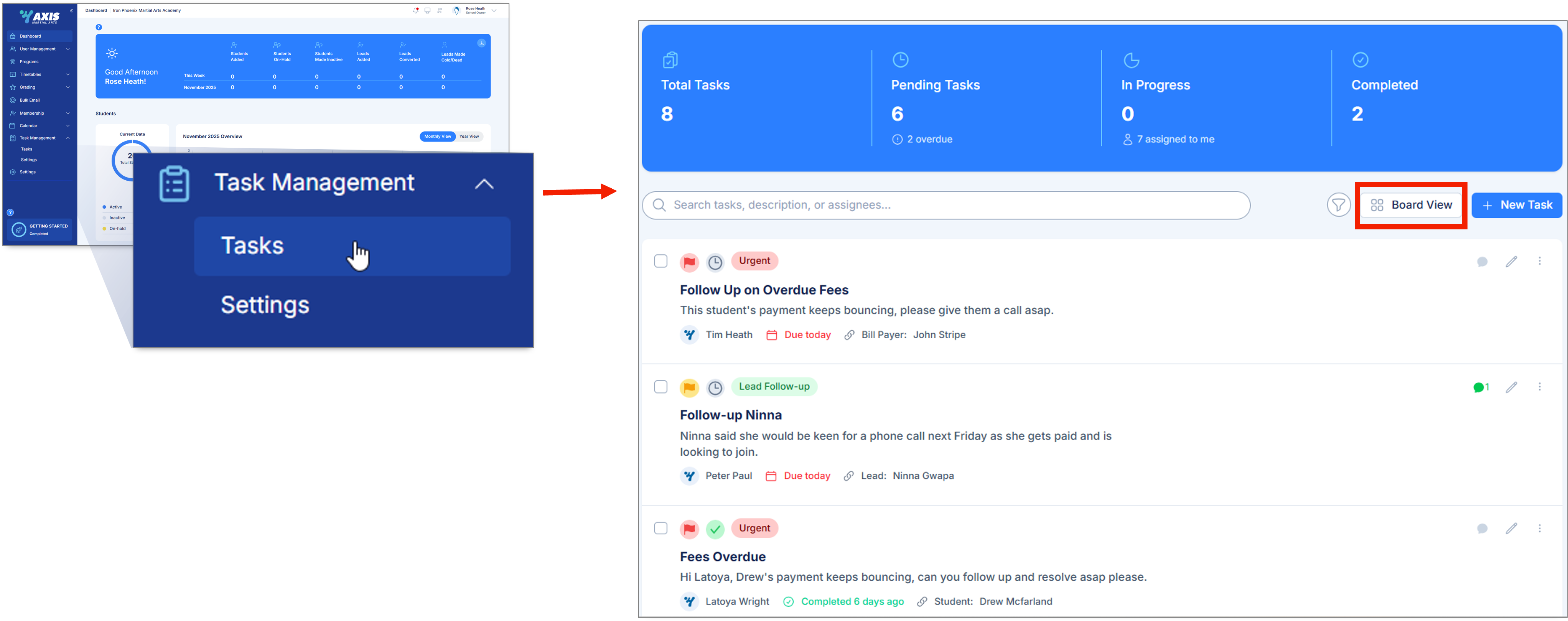 Note: The tasks are displayed in List View by default, you can click on Board View, to change the layout.