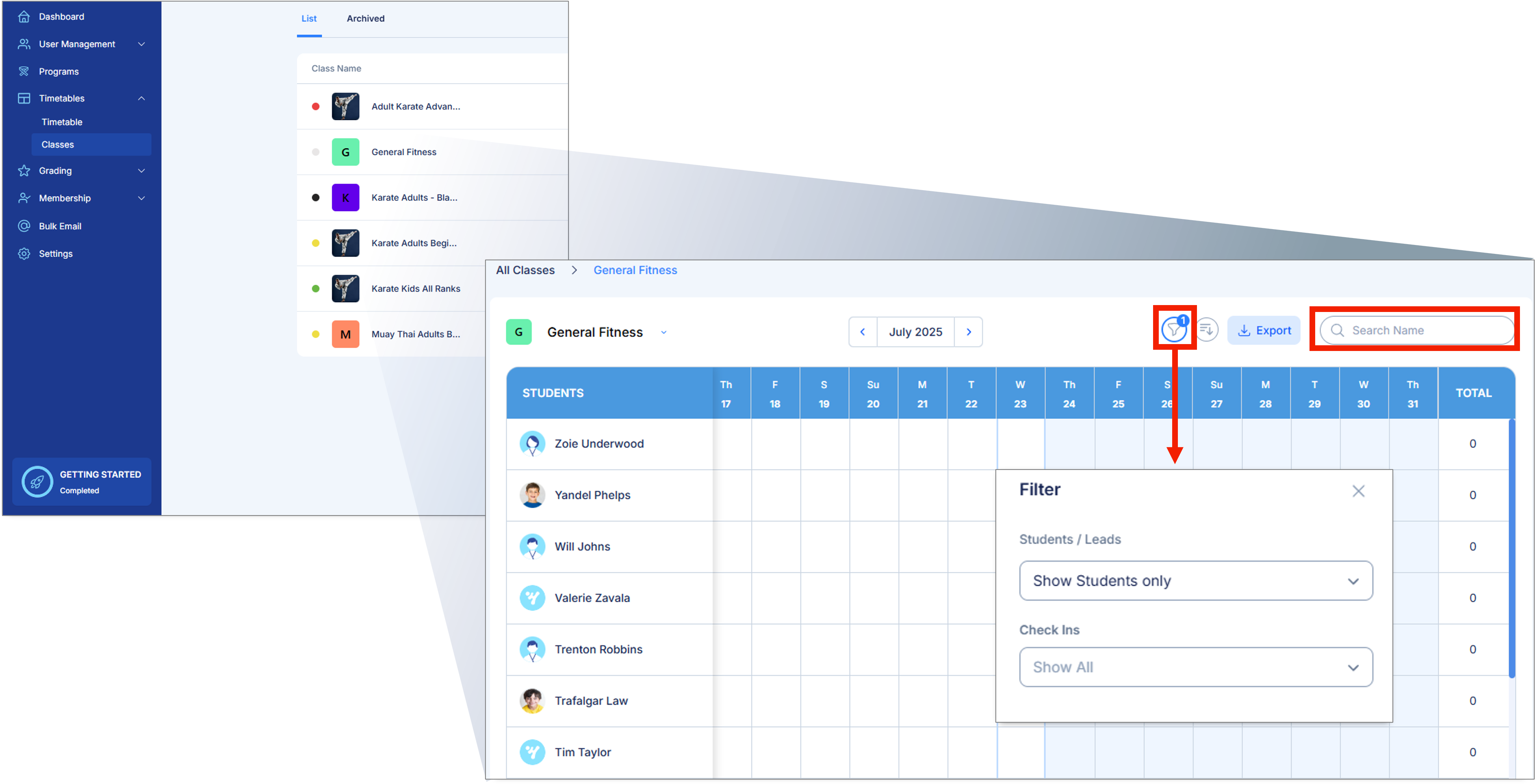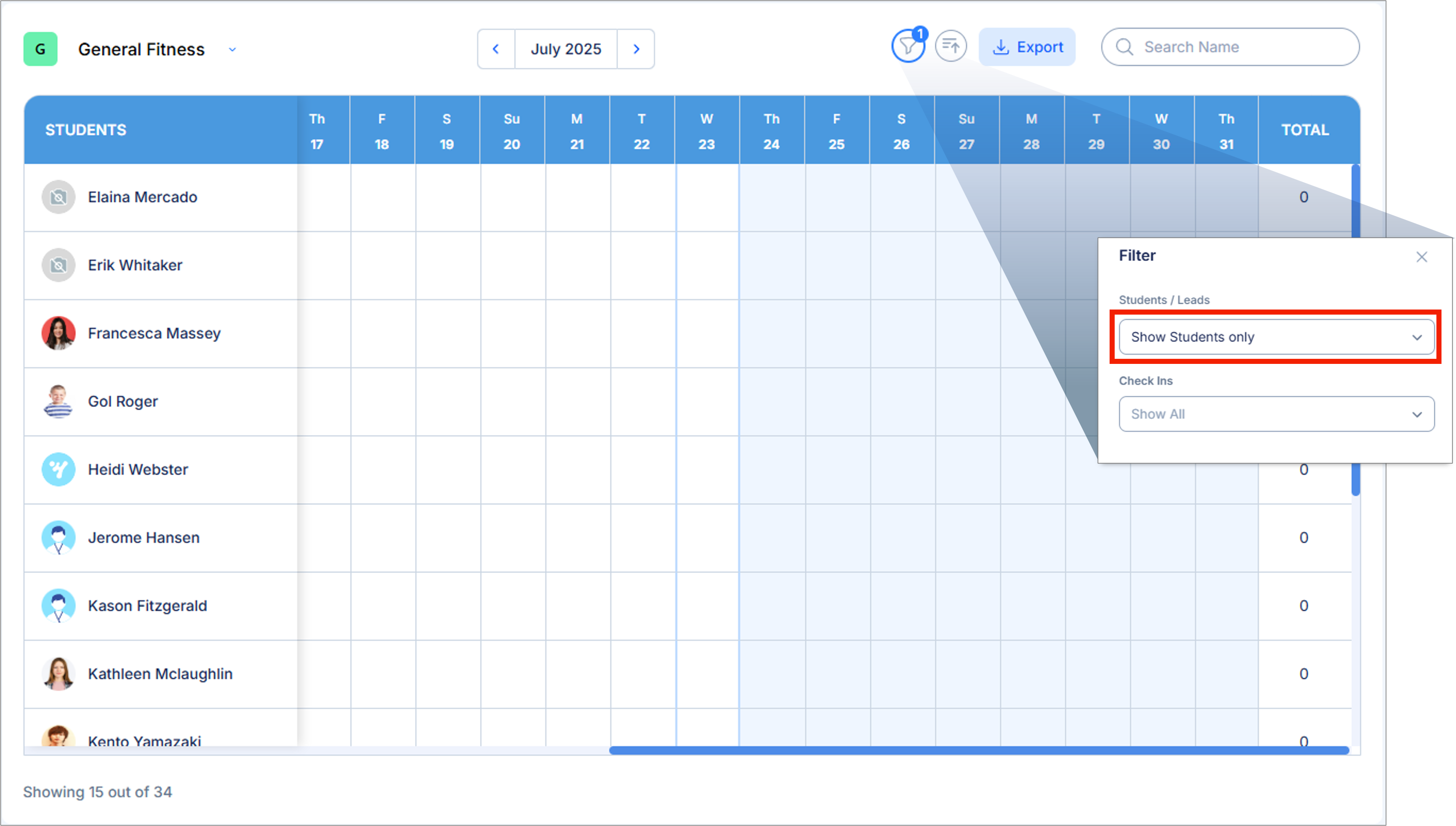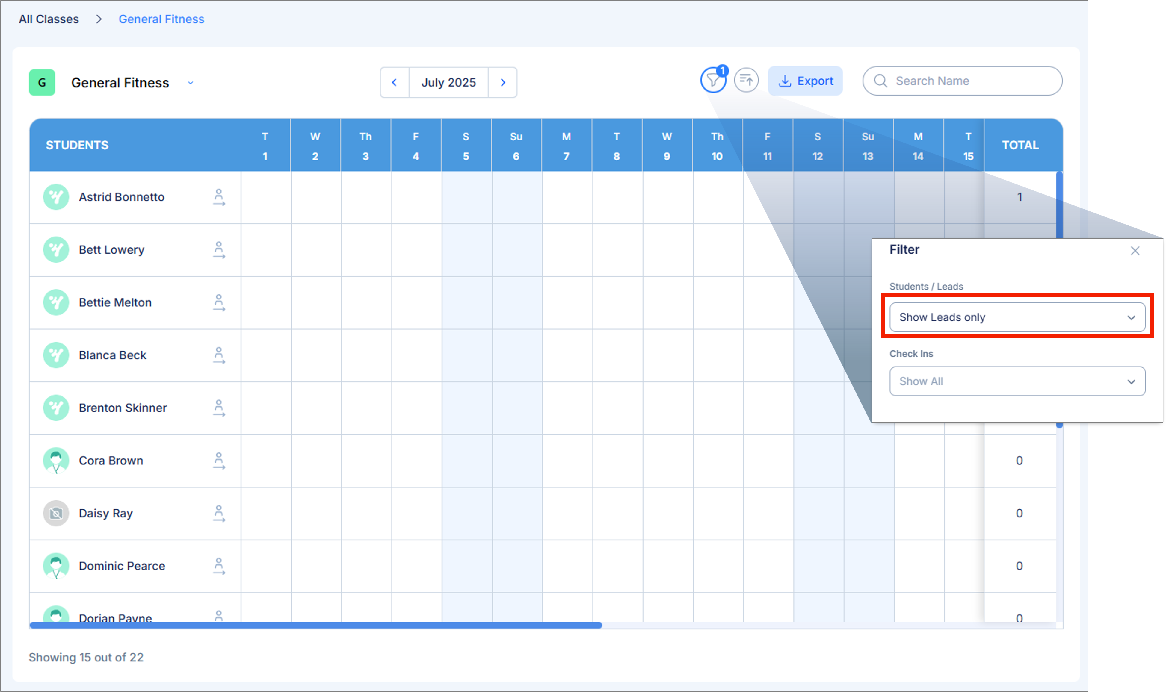 4. Filter - you can filter the classes by "Show Students only" or "Show Leads only"