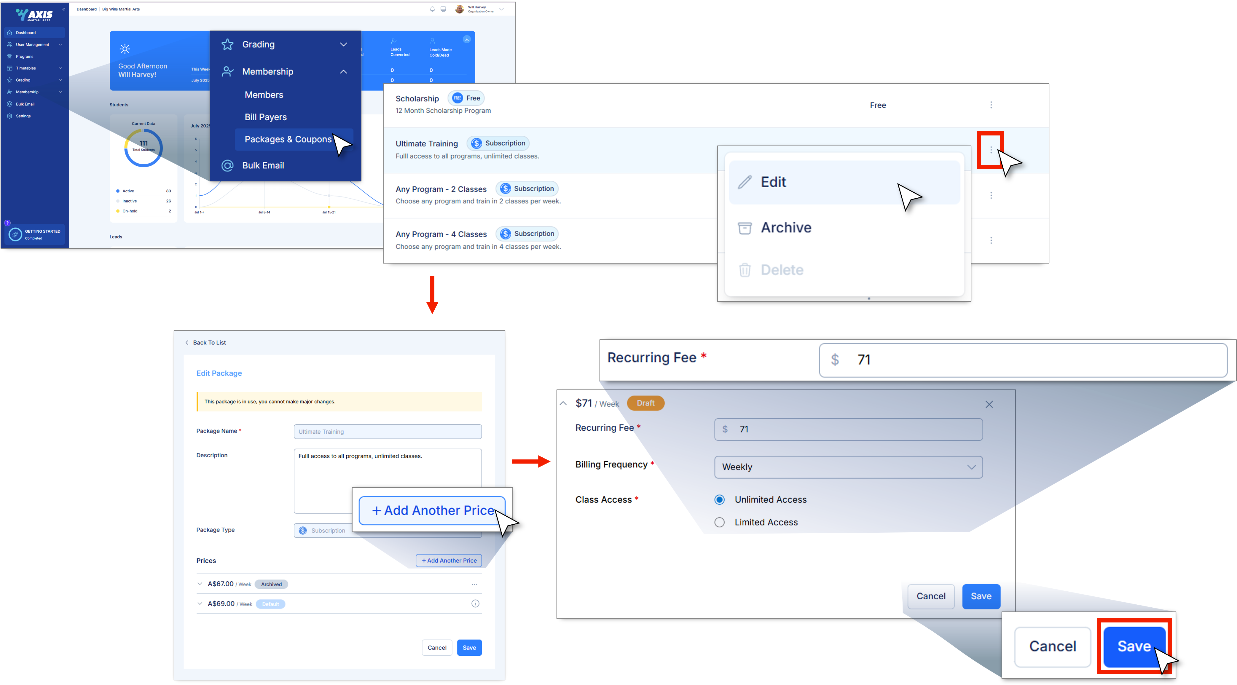 As time goes by, you may want to adjust your package fees. AXIS allows you to add a new package fee and archive the current fee.