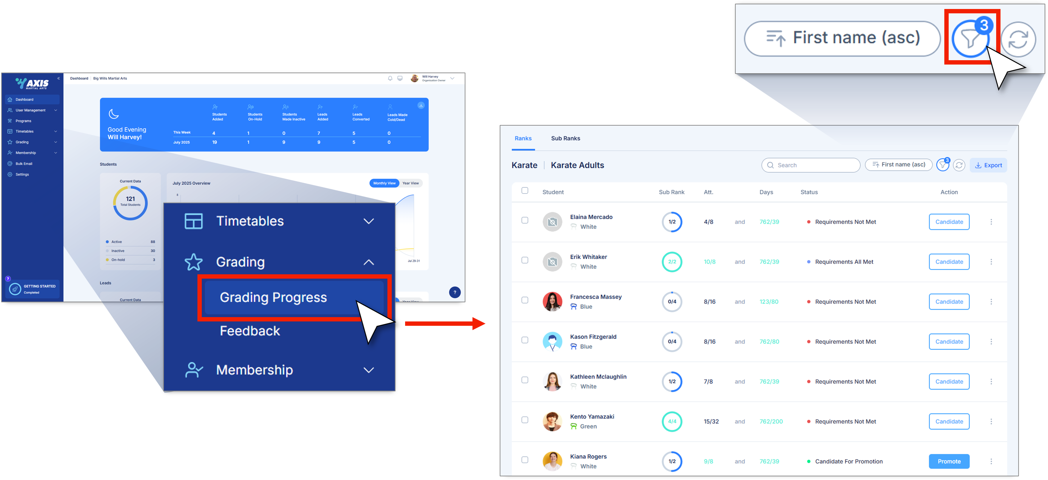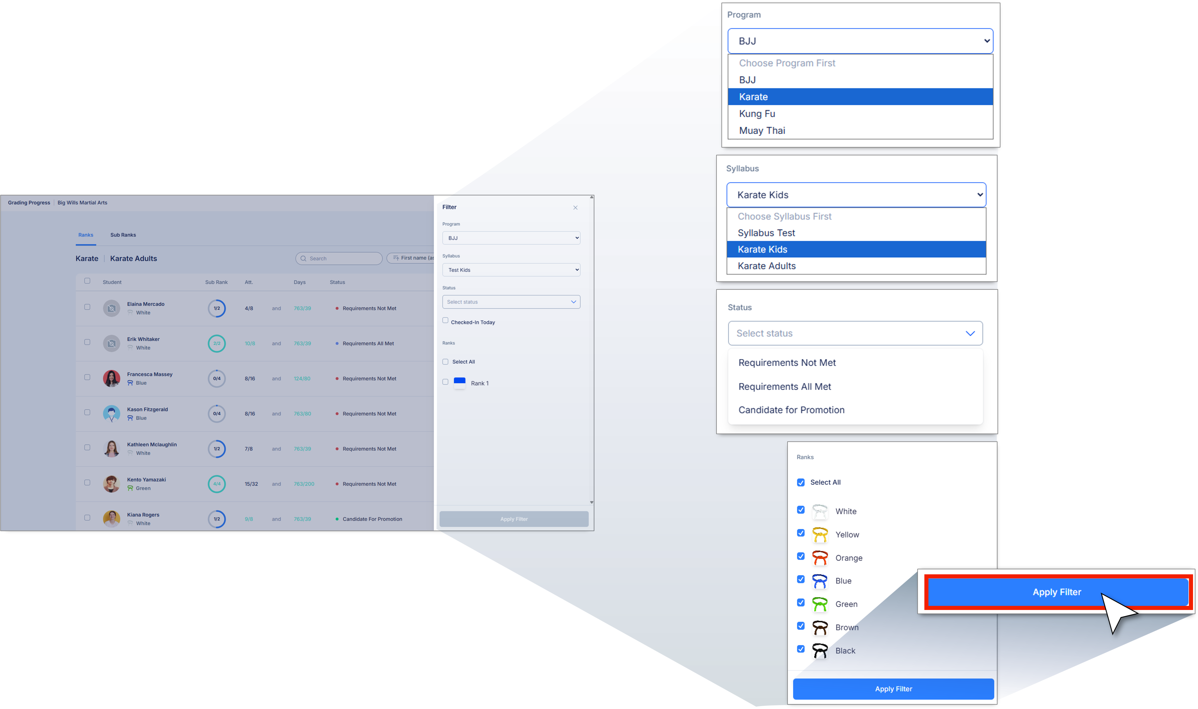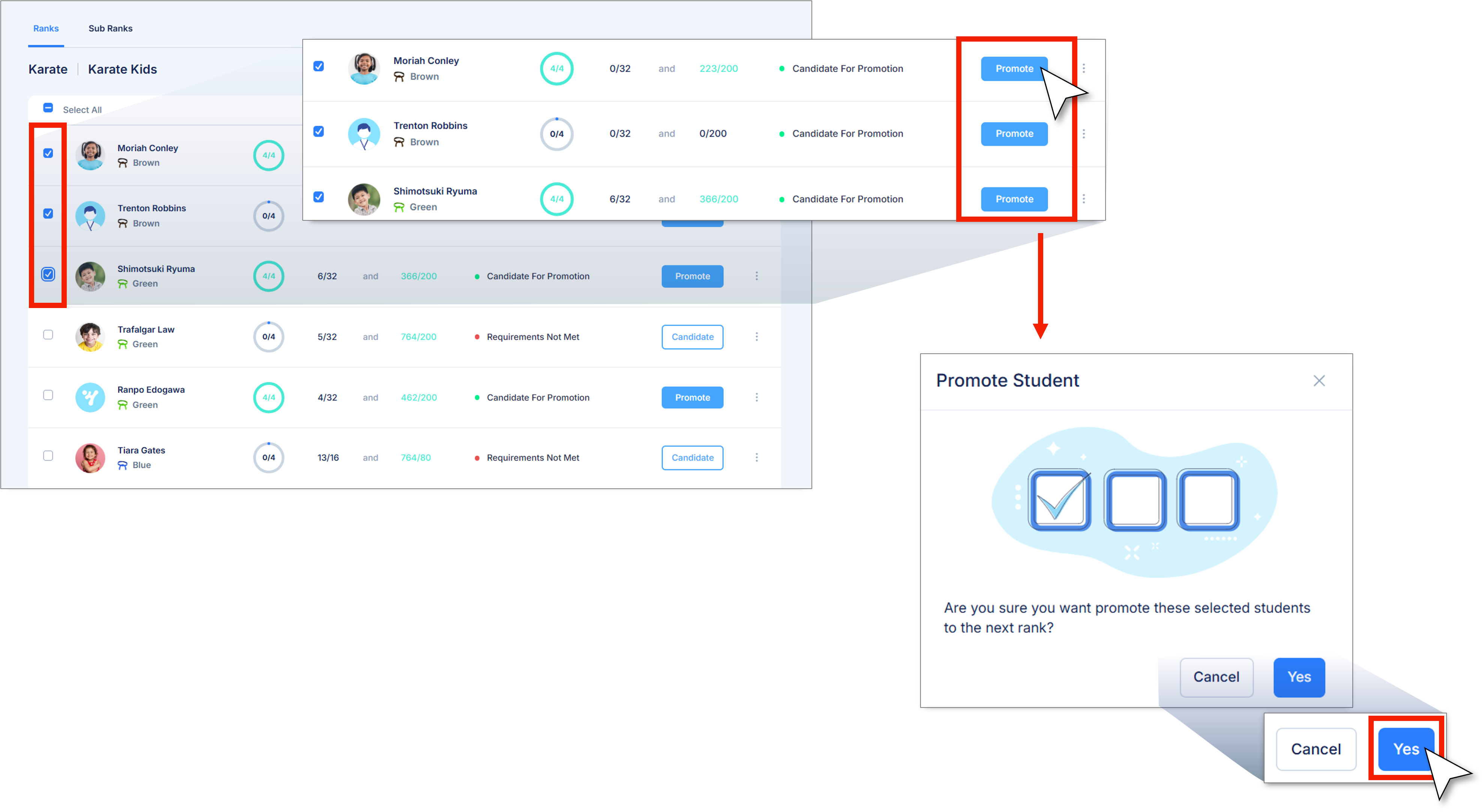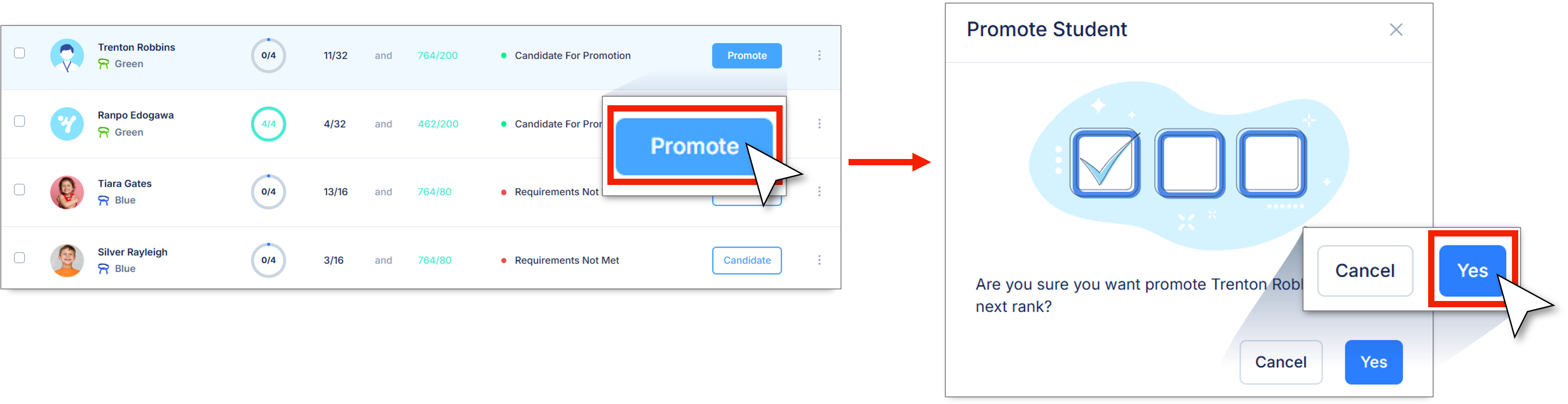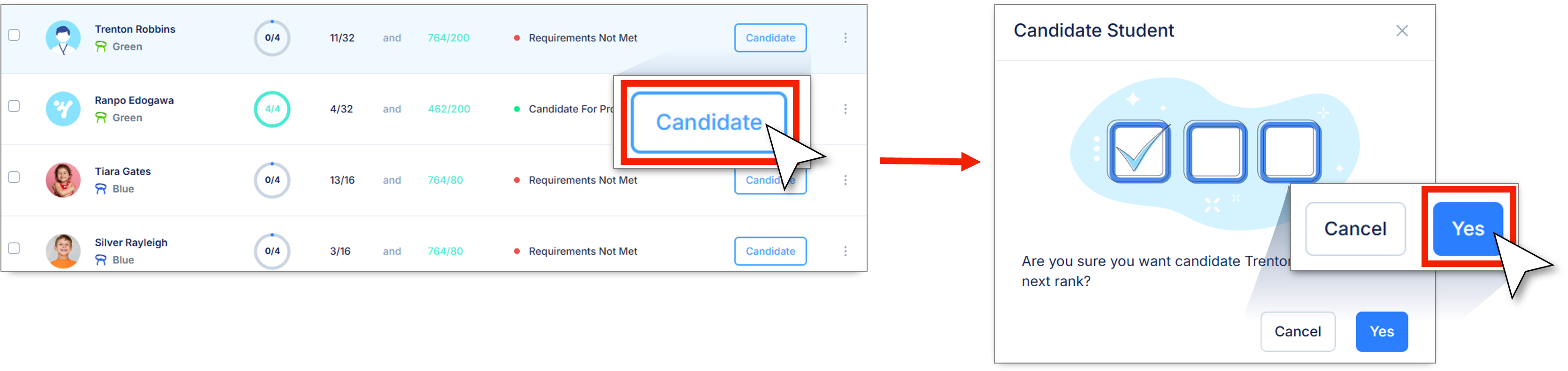 When you consider a student ready for grading, the next step is to make them a Candidate for grading. It is up to instructors to review the information in the system and make a decision on whether to grade their students. All information is a guideline and does not take into account physical skills or attitude in class.