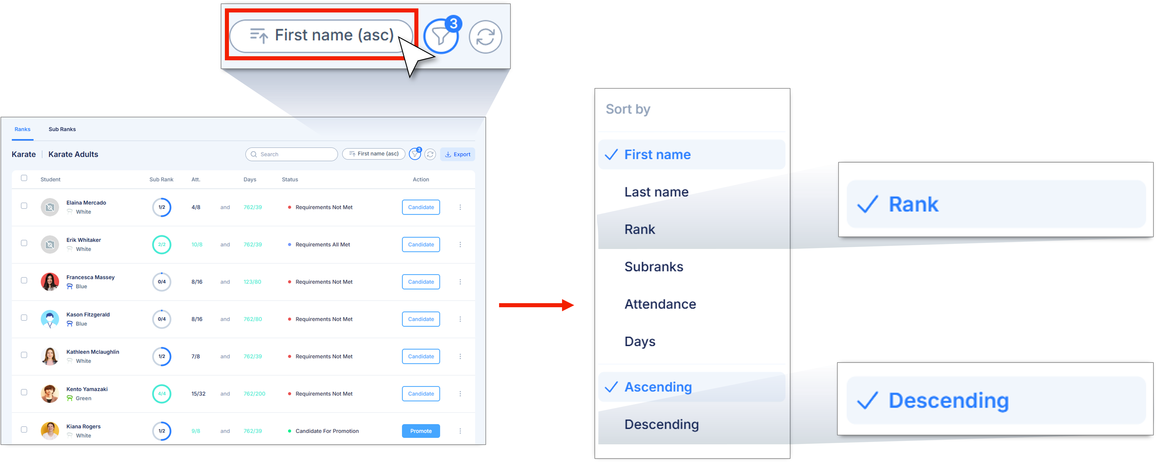 - Select your sorting preference (e.g. Last Name, Ranks, Days or Descending).