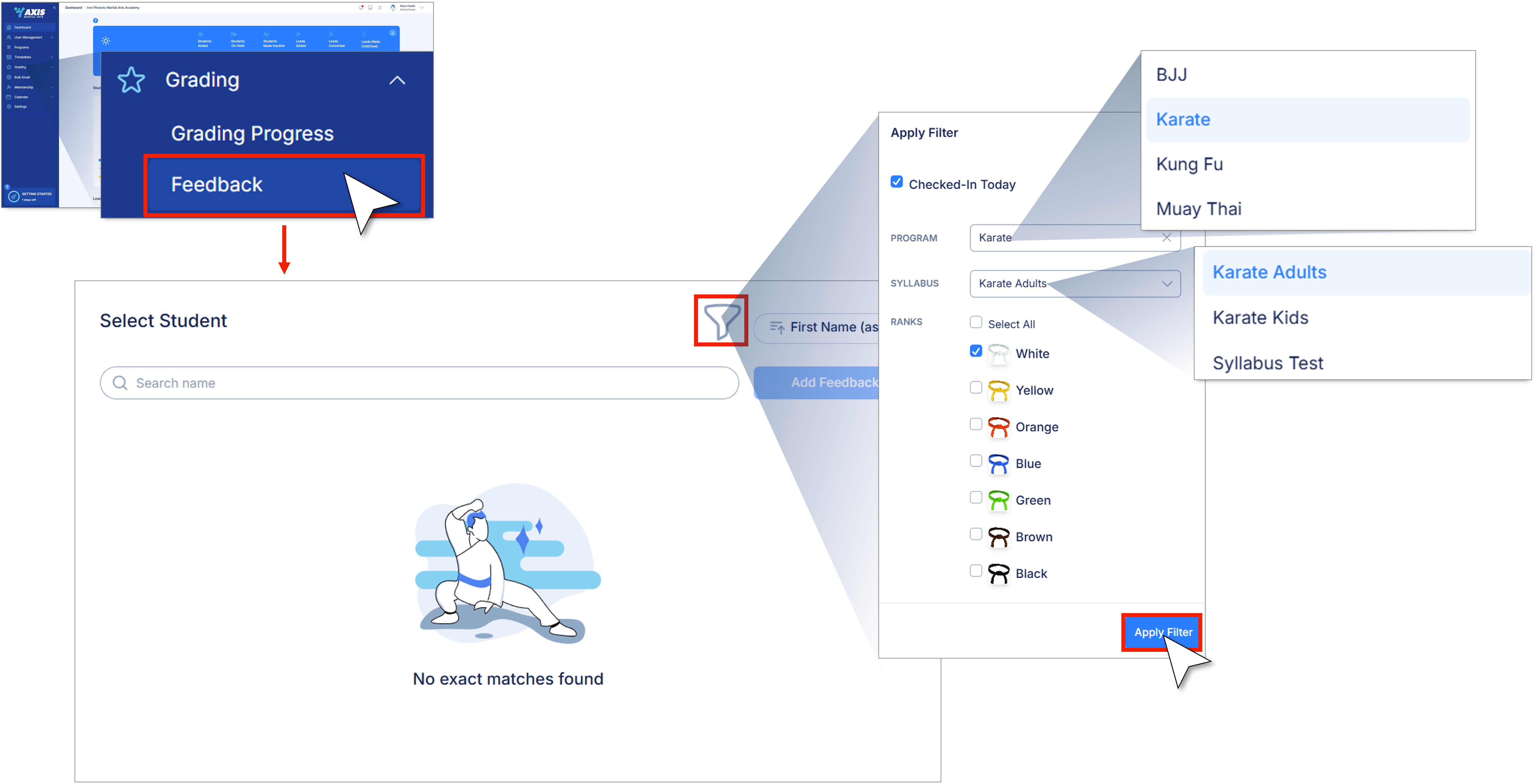 Your students are on a never ending journey of progression through the ranks of your martial arts program. AXIS tracks the progress of sessions and days on each rank, but how does it know if a student is really ready? Have they learned the skills? Do they have the right attitude?