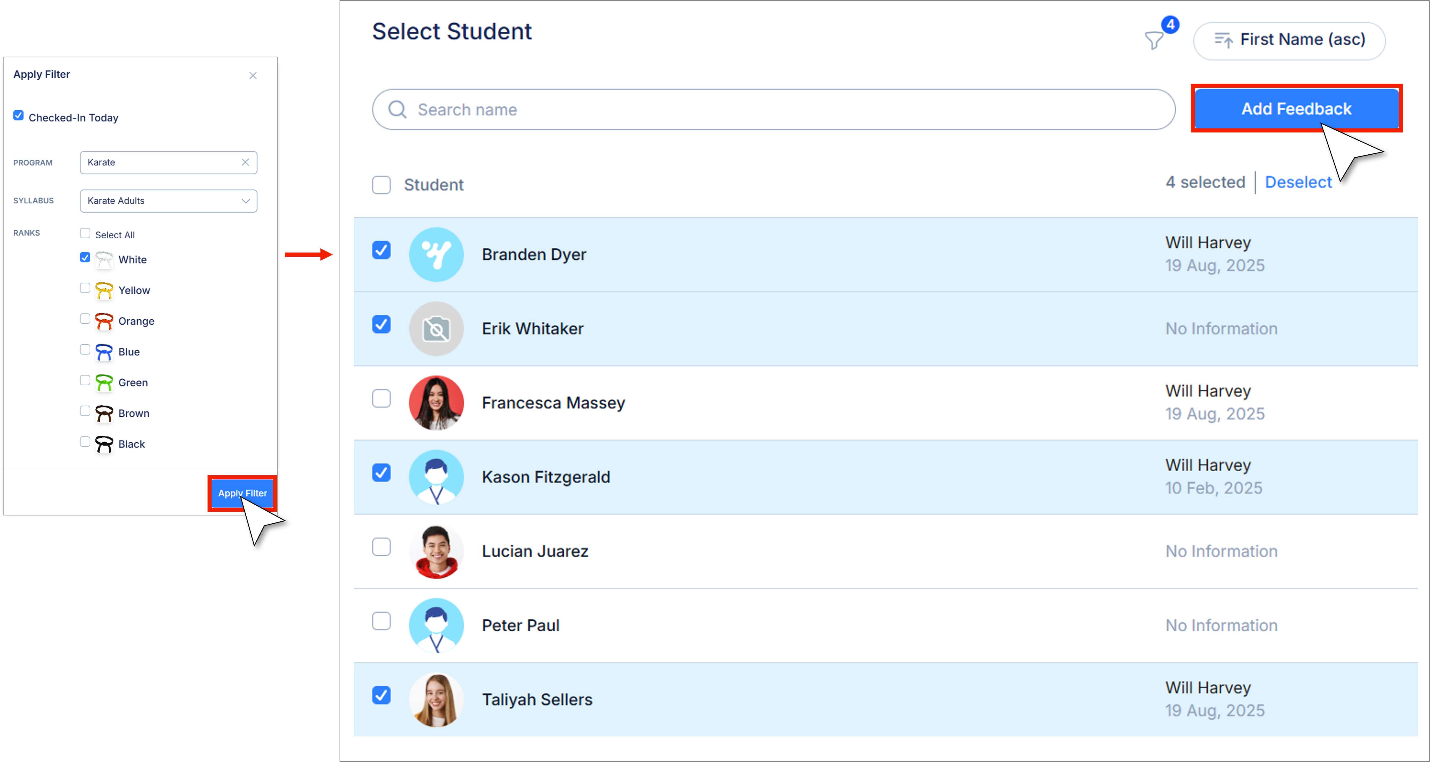 - Select ranks (for example, you may just be working with the Green belts today in an all rank class).