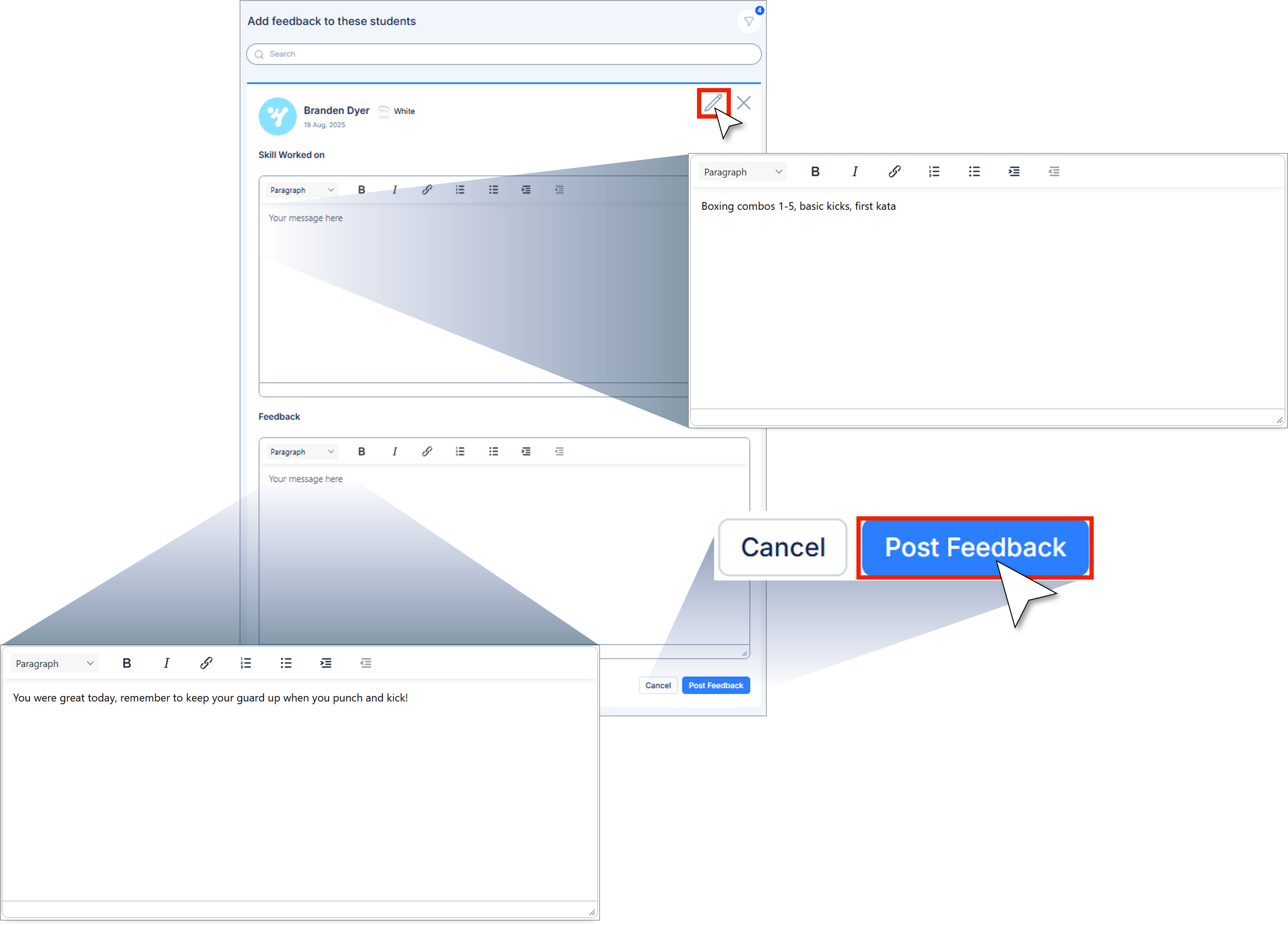 Instructor Feedback in AXIS allows you to give written feedback to a student, which then gets emailed directly to them. It's quick and easy to use, and designed to be used on a tablet or other mobile device by instructors on the floor teaching.